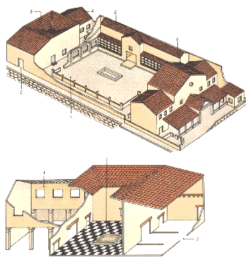 Rekonstruktion eines Wohnhauses in Herculaneum (etwa 50 n. Chr.). Im Zentrum der Hausanlage befand sich ein Garten (1) mit einem Wasserbassin in der Mitte, der an drei Seiten von Gebäuden und an der vierten von einer Mauer umschlossen war. Durch den Eingang (2) betrat man einen Vorraum, von dem man ins Atrium, die Haupthalle mit Mosaikboden, gelangte (3); auf der gegenüberliegenden Seite schloß sich das Studierzimmer (Tablinum, 4) an. In dem Gebäudetrakt an der Längsseite des Gartens lagen die Schlafräume (5) und an der Südseite kleinere Vorräume und der große Eßsaal (Triclinium, 6). Dort fanden die römischen Gastmahle statt, bei denen die Teilnehmer es sich auf Speisesofas bequem machten und die Leckereien verzehrten. |