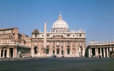 Die Peterskirche ist eine in der Vatikanstadt gelegene Grabkirche des Apostel Petrus. Sie dient als Hauptkirche des Papstes. Der Petersdom weist eine 100-jährige wechselvolle Baugeschichte auf. Im Jahre 1452 wurde der Dom unter Papst Nikolaus als Zentralbau begonnen. Fünf verschiedene Architekten arbeiteten die Jahre über an der Peterskirche des Vatikans Bramante, Raffael, Sangall, Michelangelo und Maderna. Im Jahre 1600 wurde der Zentralbau von Bramante verworfen, es wurden zwei Joche im Westen konstruiert, so daß der Grundriß ein lateinisches Kreuz ergab. 1626 errichtete Maderna die Fassade zum Petersplatz hin.