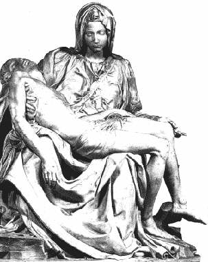 Die Statue zeigt Maria und Jesus, bereits vom Kreuz abgenommen. Die Pietá, das auf Deutsch Mitleid bedeutet, gilt dem Betrachter .Es wirkt als würde Jesus schlafen, doch der Schlaf ist nur der Bruder des Todes. Die Trauer des Leichnams wird durch seine Haltung zum Ausdruck gebracht. Maria wirkt in sich gekehrt in stiller Trauer. Die absolute Harmonie, die den Künstlern in der Renaissance so wichtig war, schafft Michelangelo nicht nur durch Haltung und Mimik, sondern im besonderem durch die Wahl des Materials. Der Bildhauer verwendet für sein Werk weißen Marmor. Durch dieses Zusammenspiel wird der Betrachter gezwungen sich hineinzubegeben. Michelangelo versucht den genauen Punkt zu treffen, damit man Gegenwart, Vergangenheit und Zukunft sieht. Die Statue soll zeigen, daß man im Tod nicht allein ist.