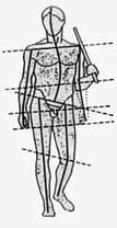 Links die schematische Darstellung einer hellenistischen Figur: Man erkennt, dass die Symmetrielinien nun sehr zahlreich sind und die Figur dadurch dramatische Formen annehmen kann.