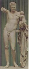 Die Staue links ist das einzig erhaltene Originalwerk des Praxiteles. Die Figur ist um 350/340 v. Chr. entstanden und 2,15 hoch. Sie zeigt Hermes, wie er auf dem linken Arm seinen Halbbruder Dionysos trägt. In der rechten Hand hielt Hermes ehemals eine Weintraube, nach der der Kleine greifen will.